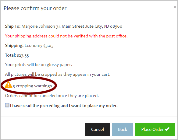 The cropping warning gives you a chance to amend your cropping. If you are satisfied with your cropping, simply approve your order in the Confirmation screen at the end of the checkout process. Your order cannot be changed after it has been placed.